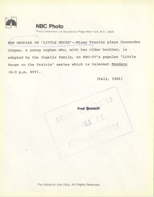 Little House on the Prairie Missy Francis Original 7x9 Photo Stamped with Snipe 1981 Near Mint Condition This item is an ORIGINAL 8x10 photo from the historic archives of Silver Screen Mementos. This original photograph was made in the actual year the film, television show or event was produced. The movie studios produced publicity photographs for distribution to the press, photo agencies and publicity departments to advertise the film/tv show or event. Very often original photos have press release information on the reverse of the photo - movie credits, description of the scene, event and people involved. This is a historic piece of cinema art and is being offered from one collector to another, no rights given or implied. Silver Screen are gradually releasing thousands of Original Photographs, Transparencies, Negatives, Lobby Cards, Posters, Magazines and other memorabilia from our historic archive.