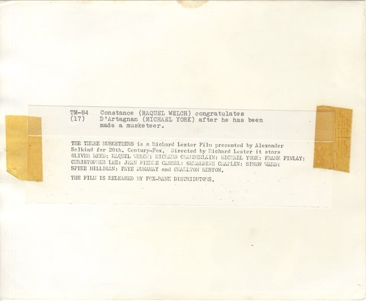 The Three Musketeers 1973 Michael York, Raquel Welch Original 8x10 Photo Stamped with Snipe VG Condition This item is an ORIGINAL 8x10 photo from the historic archives of Silver Screen Mementos. This original photograph was made in the actual year the film, television show or event was produced. The movie studios produced publicity photographs for distribution to the press, photo agencies and publicity departments to advertise the film/tv show or event. Very often original photos have press release information on the reverse of the photo - movie credits, description of the scene, event and people involved. This is a historic piece of cinema art and is being offered from one collector to another, no rights given or implied. Silver Screen are gradually releasing thousands of Original Photographs, Transparencies, Negatives, Lobby Cards, Posters, Magazines and other memorabilia from our historic archive.