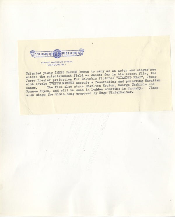 Diamond Head 1962 Shirtless James Darren dancing with barefoot Yvette Mimieux Original 8x10 Photo Stamped with Snipe VG/Near Mint Condition This item is an ORIGINAL 8x10 photo from the historic archives of Silver Screen Mementos. This original photograph was made in the actual year the film, television show or event was produced. The movie studios produced publicity photographs for distribution to the press, photo agencies and publicity departments to advertise the film/tv show or event. Very often original photos have press release information on the reverse of the photo - movie credits, description of the scene, event and people involved. This is a historic piece of cinema art and is being offered from one collector to another, no rights given or implied. Silver Screen are gradually releasing thousands of Original Photographs, Transparencies, Negatives, Lobby Cards, Posters, Magazines and other memorabilia from our historic archive.
