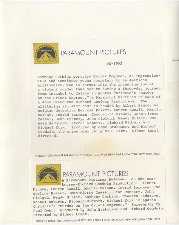 Murder on the Orient Express Anthony Perkins Original 8x10 Photo with Snipe 1974 Near Mint Condition This item is an ORIGINAL 8x10 photo from the historic archives of Silver Screen Mementos. This original photograph was made in the actual year the film, television show or event was produced. The movie studios produced publicity photographs for distribution to the press, photo agencies and publicity departments to advertise the film/tv show or event. Very often original photos have press release information on the reverse of the photo - movie credits, description of the scene, event and people involved. This is a historic piece of cinema art and is being offered from one collector to another, no rights given or implied. Silver Screen are gradually releasing thousands of Original Photographs, Transparencies, Negatives, Lobby Cards, Posters, Magazines and other memorabilia from our historic archive.