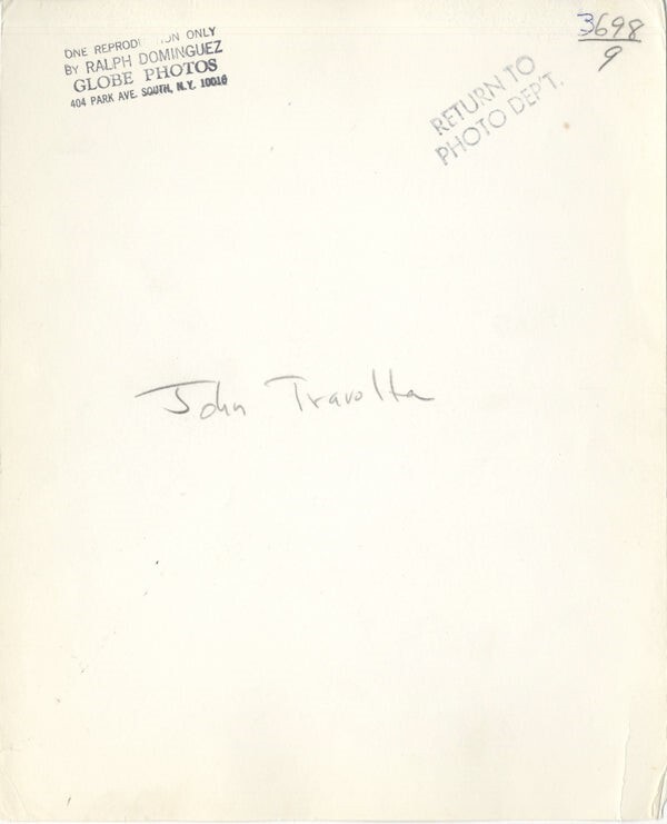 John Travolta Candid Event 1970's smoking cigar Original 8x10 Photo Stamped VG Condition This item is an ORIGINAL 8x10 photo from the historic archives of Silver Screen Mementos. This original photograph was made in the actual year the film, television show or event was produced. The movie studios produced publicity photographs for distribution to the press, photo agencies and publicity departments to advertise the film/tv show or event. Very often original photos have press release information on the reverse of the photo - movie credits, description of the scene, event and people involved. This is a historic piece of cinema art and is being offered from one collector to another, no rights given or implied. Silver Screen are gradually releasing thousands of Original Photographs, Transparencies, Negatives, Lobby Cards, Posters, Magazines and other memorabilia from our historic archive.