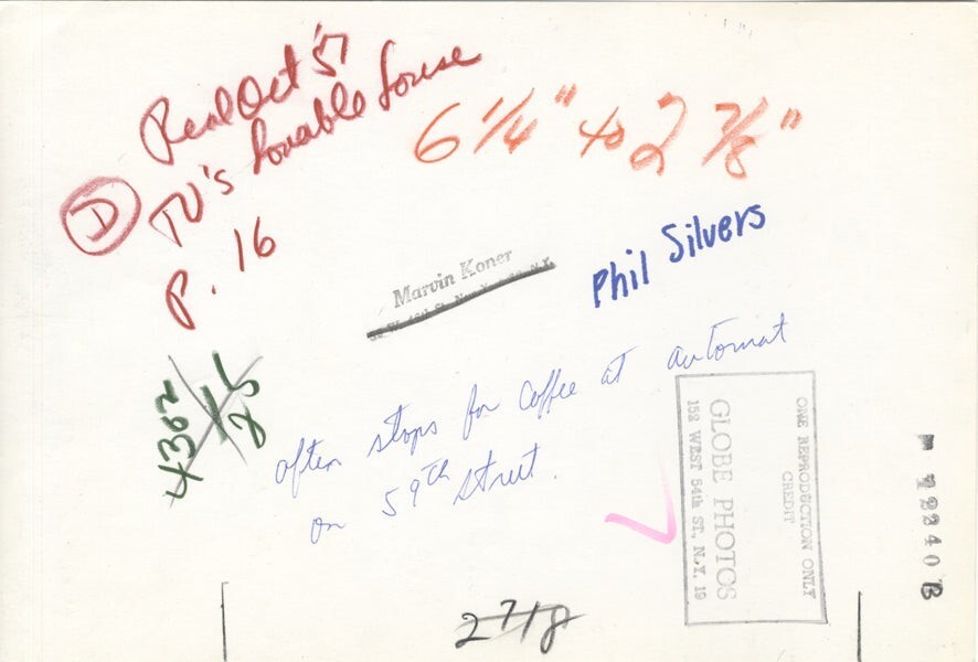 Phil Silvers 1950's Automat 59th St. New York City Original 7x9 approx Photo Stamped Near Mint Condition This item is an ORIGINAL 8x10 photo from the historic archives of Silver Screen Mementos. This original photograph was made in the actual year the film, television show or event was produced. The movie studios produced publicity photographs for distribution to the press, photo agencies and publicity departments to advertise the film/tv show or event. Very often original photos have press release information on the reverse of the photo - movie credits, description of the scene, event and people involved. This is a historic piece of cinema art and is being offered from one collector to another, no rights given or implied. Silver Screen are gradually releasing thousands of Original Photographs, Transparencies, Negatives, Lobby Cards, Posters, Magazines and other memorabilia from our historic archive.