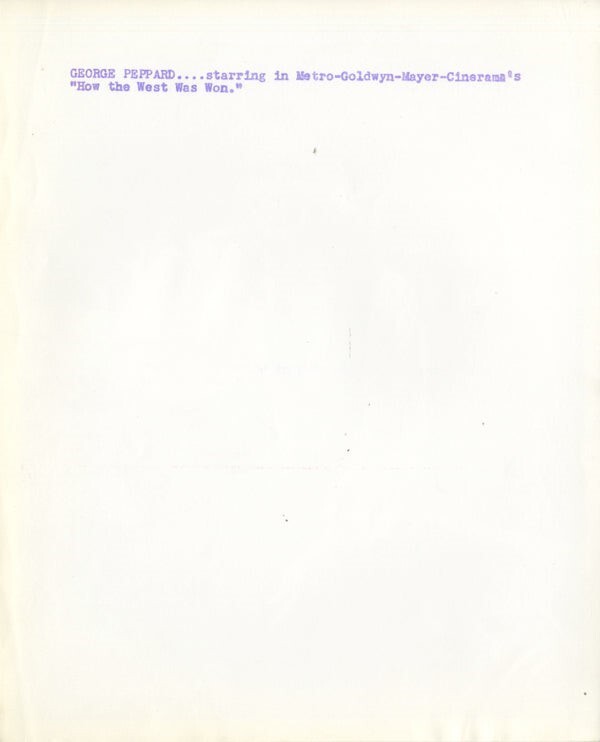 George Peppard 1962 MGM Publicity How the West Was Won Original 8x10 Photo with Snipe VG/Near Mint Condition This item is an ORIGINAL 8x10 photo from the historic archives of Silver Screen Mementos. This original photograph was made in the actual year the film, television show or event was produced. The movie studios produced publicity photographs for distribution to the press, photo agencies and publicity departments to advertise the film/tv show or event. Very often original photos have press release information on the reverse of the photo - movie credits, description of the scene, event and people involved. This is a historic piece of cinema art and is being offered from one collector to another, no rights given or implied. Silver Screen are gradually releasing thousands of Original Photographs, Transparencies, Negatives, Lobby Cards, Posters, Magazines and other memorabilia from our historic archive.