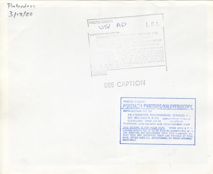 Chrissie Hynde The Pretenders playing guitar in concert Original 8x10 Photo Stamped VG/Near Mint Condition This is an Original vintage photograph from the year of the concert, photo shoot or event measuring approximately 8x10 inches (20x25 cm) unless otherwise stated. Many Original vintage photographs carry the agency or photographer stamp on the back. This is a rare collectors item being offered from one collector to another, no nights given or implied. Silver Screen are gradually releasing thousands of Original Photographs, Transparencies, Negatives, Lobby Cards, Posters, Magazines and other memorabilia from our historic archive.