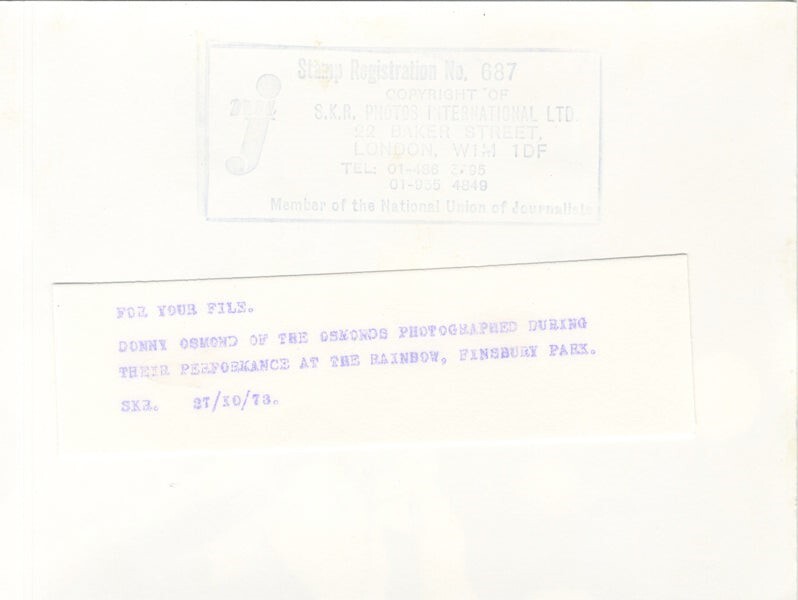 Donny Osmond singing at 1973 concert at the Rainbow, Finsbury Park Original 6x8 Photo Stamped with Snipe Near Mint Condition This is an Original vintage photograph from the year of the concert, photo shoot or event measuring approximately 7x9 inches (18x23cm) unless otherwise stated. Many Original vintage photographs carry the agency or photographer stamp on the back. This is a rare collectors item being offered from one collector to another, no nights given or implied. Silver Screen are gradually releasing thousands of Original Photographs, Transparencies, Negatives, Lobby Cards, Posters, Magazines and other memorabilia from our historic archive.