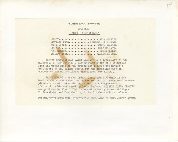 Indise Daisy Clover 1965 Natalie Wood Robert Redford Original 8x10 Photo w snipe VG/Near Mint Condition This item is an ORIGINAL 8x10 photo from the historic archives of Silver Screen Mementos. This original photograph was made in the actual year the film, television show or event was produced. The movie studios produced publicity photographs for distribution to the press, photo agencies and publicity departments to advertise the film/tv show or event. Very often original photos have press release information on the reverse of the photo - movie credits, description of the scene, event and people involved. This is a historic piece of cinema art and is being offered from one collector to another, no rights given or implied. Silver Screen are gradually releasing thousands of Original Photographs, Transparencies, Negatives, Lobby Cards, Posters, Magazines and other memorabilia from our historic archive.