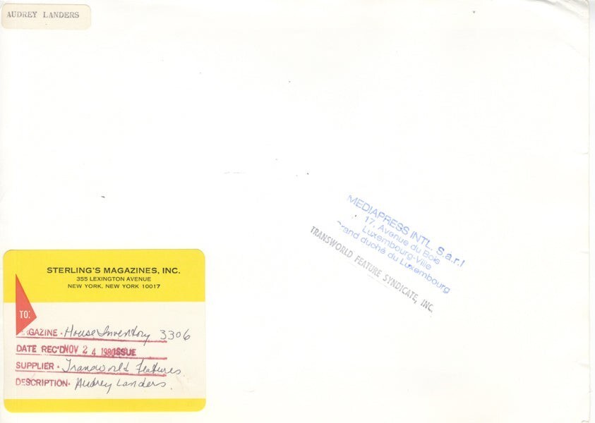 Audrey Landers 1980's Dallas era riding horseback Original 8x12 approx Photo Stamped Good/VG Condition (wear to edges, creasing in corners) This item is an ORIGINAL 8x10 photo from the historic archives of Silver Screen Mementos. This original photograph was made in the actual year the film, television show or event was produced. The movie studios produced publicity photographs for distribution to the press, photo agencies and publicity departments to advertise the film/tv show or event. Very often original photos have press release information on the reverse of the photo - movie credits, description of the scene, event and people involved. This is a historic piece of cinema art and is being offered from one collector to another, no rights given or implied. Silver Screen are gradually releasing thousands of Original Photographs, Transparencies, Negatives, Lobby Cards, Posters, Magazines and other memorabilia from our historic archive.