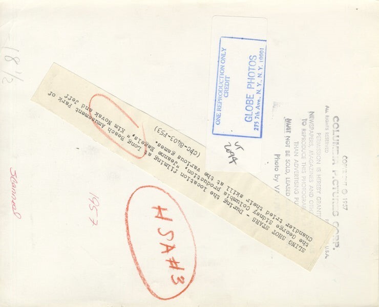 Jeanne Eagels 1957 Kim Novak, Jeff Chandler Publicity on location Long Beach Amusement Park Original 8x10 Photo Stamped with Snipe VG Condition (pen marks right margin, wear to right corners) This item is an ORIGINAL 8x10 photo from the historic archives of Silver Screen Mementos. This original photograph was made in the actual year the film, television show or event was produced. The movie studios produced publicity photographs for distribution to the press, photo agencies and publicity departments to advertise the film/tv show or event. Very often original photos have press release information on the reverse of the photo - movie credits, description of the scene, event and people involved. This is a historic piece of cinema art and is being offered from one collector to another, no rights given or implied. Silver Screen are gradually releasing thousands of Original Photographs, Transparencies, Negatives, Lobby Cards, Posters, Magazines and other memorabilia from our historic archive.