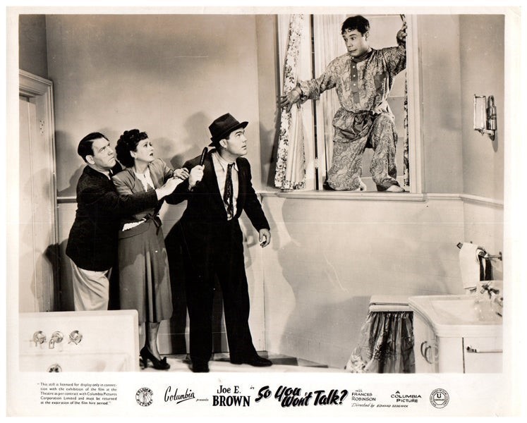 So You Won't Talk 1940 Original Lobby Card Joe E Brown Frances Robinson VG Condition Silver Screen Mementos are pleased to be able to offer this authentic original Lobby Card measuring 8x10 inches. This lobby card is from Great Britain and was printed during the actual year the film was released in movie theaters. The lobby card (also known as Front of House/ FOH card in the UK) was created by the film studios to publicize the movie and was intended for display outside the movie theatre in special glass display boxes. These are NOT reproductions! You are looking at a truly original piece of cinema art, a genuine collector's item. We have a huge archive of over 250,000 original lobby cards, mostly from the 1930's to the 1980's. We will be releasing many more rare gems from our vast collection, which will include lobby cards, original photographs, movie stills, magazines, brochures negatives, transparencies, slides and other collectible items of movie memorabilia.