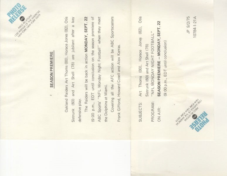 Oakland Raiders NFL Football Art Thoms, Horace Jones, Otis Sistrunk, Art Shell Original 7x9 Photo with ABC Snipe 1975 VG Condition This is an original photograph from our historic archives. We have a huge archive of original photographs, negatives, transparencies, posters, magazines and rare memorabilia that we are gradually releasing.