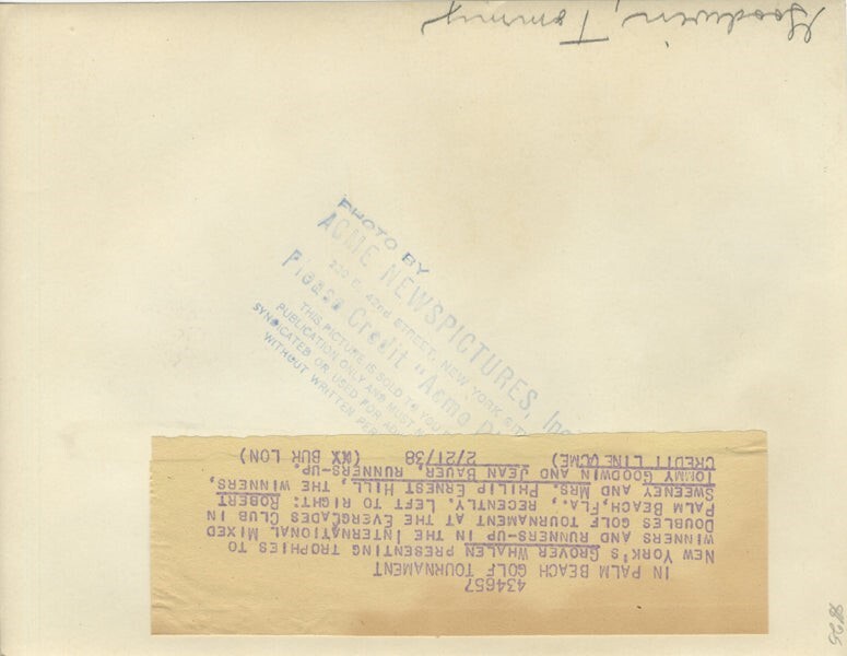 Palm Beach Golf Tournament 1938 Robert Sweeney, Tommy Goodwin, Mrs. Philip Ernest Hill, Jean Bauer, Grover Whalen Everglades Club Original 7x9 Photo Stamped with Snipe VG/Near Mint Condition This is an original photograph from our historic archives. We have a huge archive of original photographs, negatives, transparencies, posters, magazines and rare memorabilia that we are gradually releasing.