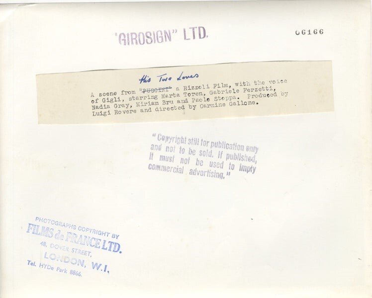 Puccini 1953 Marta Toren embracing Gabriele Ferzetti Original 8x10 Photo Stamped with Snipe VG/Near Mint Condition This item is an ORIGINAL 8x10 photo from the historic archives of Silver Screen Mementos. This original photograph was made in the actual year the film, television show or event was produced. The movie studios produced publicity photographs for distribution to the press, photo agencies and publicity departments to advertise the film/tv show or event. Very often original photos have press release information on the reverse of the photo - movie credits, description of the scene, event and people involved. This is a historic piece of cinema art and is being offered from one collector to another, no rights given or implied. Silver Screen are gradually releasing thousands of Original Photographs, Transparencies, Negatives, Lobby Cards, Posters, Magazines and other memorabilia from our historic archive.