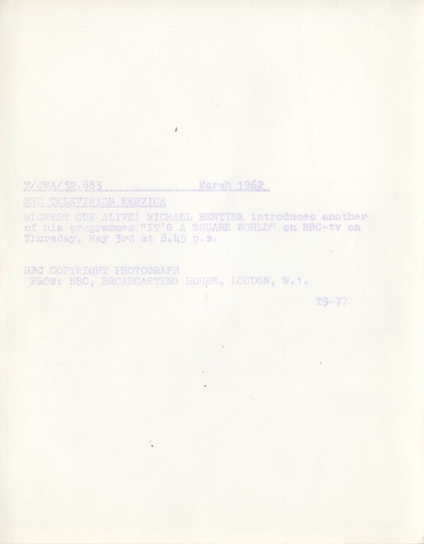 Michael Bentine It's a Square World holding gun Original 6x8 approx Photo Stamped with Snipe 1962 Near Mint Condition This item is an ORIGINAL 8x10 photo from the historic archives of Silver Screen Mementos. This original photograph was made in the actual year the film, television show or event was produced. The movie studios produced publicity photographs for distribution to the press, photo agencies and publicity departments to advertise the film/tv show or event. Very often original photos have press release information on the reverse of the photo - movie credits, description of the scene, event and people involved. This is a historic piece of cinema art and is being offered from one collector to another, no rights given or implied. Silver Screen are gradually releasing thousands of Original Photographs, Transparencies, Negatives, Lobby Cards, Posters, Magazines and other memorabilia from our historic archive.