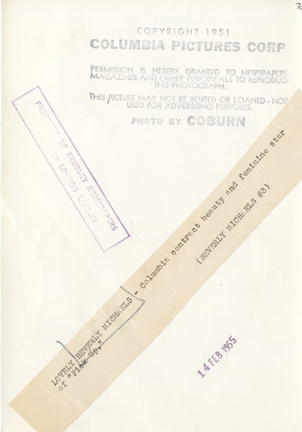 Beverly Michaels Pick Up 1951 Studio Glamour Pin up Original 6x8 Photo Stamped with Snipe VG Condition This item is an ORIGINAL 8x10 photo from the historic archives of Silver Screen Mementos. This original photograph was made in the actual year the film, television show or event was produced. The movie studios produced publicity photographs for distribution to the press, photo agencies and publicity departments to advertise the film/tv show or event. Very often original photos have press release information on the reverse of the photo - movie credits, description of the scene, event and people involved. This is a historic piece of cinema art and is being offered from one collector to another, no rights given or implied. Silver Screen are gradually releasing thousands of Original Photographs, Transparencies, Negatives, Lobby Cards, Posters, Magazines and other memorabilia from our historic archive.