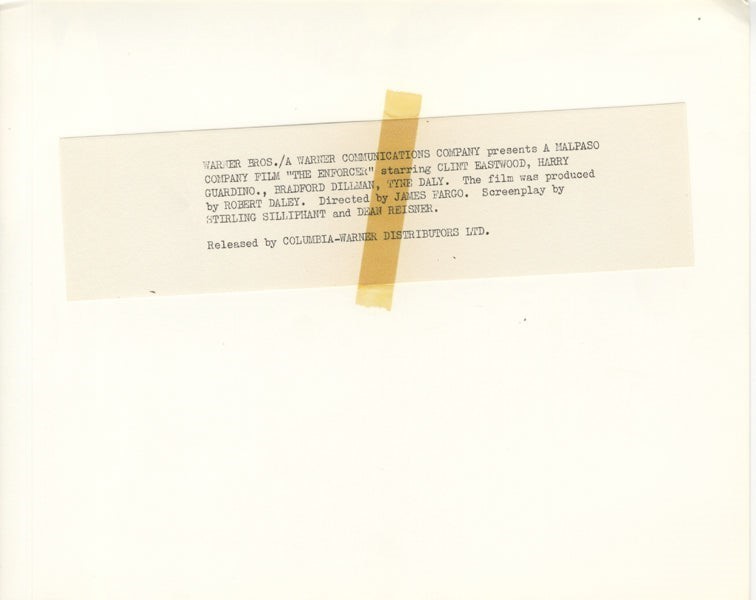 The Enforcer Clint Eastwood 1976 Dirty Harry Callahan Original 8x10 Photo with Snipe Near Mint Condition This item is an ORIGINAL 8x10 photo from the historic archives of Silver Screen Mementos. This original photograph was made in the actual year the film, television show or event was produced. The movie studios produced publicity photographs for distribution to the press, photo agencies and publicity departments to advertise the film/tv show or event. Very often original photos have press release information on the reverse of the photo - movie credits, description of the scene, event and people involved. This is a historic piece of cinema art and is being offered from one collector to another, no rights given or implied. Silver Screen are gradually releasing thousands of Original Photographs, Transparencies, Negatives, Lobby Cards, Posters, Magazines and other memorabilia from our historic archive.