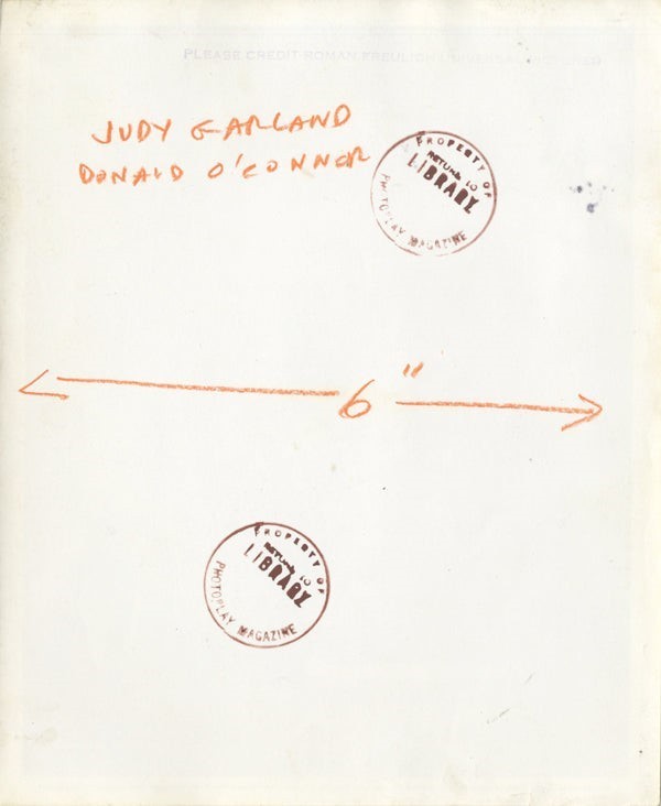 Judy Garland Kissing Donald O'Connor Original 8x10 Photo 1943 Hollywood Studio Western Dance Party Stamped VG Condition This item is an ORIGINAL 8x10 photo from the historic archives of Silver Screen Mementos. This original photograph was made in the actual year the film, television show or event was produced. The movie studios produced publicity photographs for distribution to the press, photo agencies and publicity departments to advertise the film/tv show or event. Very often original photos have press release information on the reverse of the photo - movie credits, description of the scene, event and people involved. This is a historic piece of cinema art and is being offered from one collector to another, no rights given or implied. Silver Screen are gradually releasing thousands of Original Photographs, Transparencies, Negatives, Lobby Cards, Posters, Magazines and other memorabilia from our historic archive.