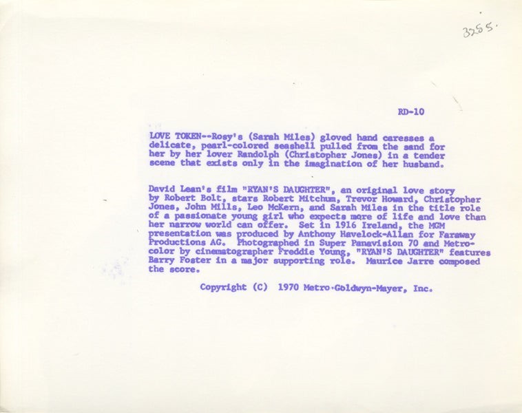 Ryan's Daughter Original 8x10 Photo Sarah Miles, Christopher Jones 1970 with Snipe VG/Near Mint Condition This item is an ORIGINAL 8x10 photo from the historic archives of Silver Screen Mementos. This original photograph was made in the actual year the film, television show or event was produced. The movie studios produced publicity photographs for distribution to the press, photo agencies and publicity departments to advertise the film/tv show or event. Very often original photos have press release information on the reverse of the photo - movie credits, description of the scene, event and people involved. This is a historic piece of cinema art and is being offered from one collector to another, no rights given or implied. Silver Screen are gradually releasing thousands of Original Photographs, Transparencies, Negatives, Lobby Cards, Posters, Magazines and other memorabilia from our historic archive.