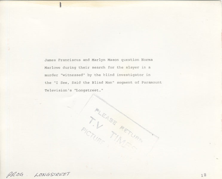 Longstreet James Franciscus, Marlyn Mason, Norma Marlowe, I See Said the Blind Man Episode Original 8x10 Photo Stamped with Snipe Near Mint Condition This item is an ORIGINAL 8x10 photo from the historic archives of Silver Screen Mementos. This original photograph was made in the actual year the film, television show or event was produced. The movie studios produced publicity photographs for distribution to the press, photo agencies and publicity departments to advertise the film/tv show or event. Very often original photos have press release information on the reverse of the photo - movie credits, description of the scene, event and people involved. This is a historic piece of cinema art and is being offered from one collector to another, no rights given or implied. Silver Screen are gradually releasing thousands of Original Photographs, Transparencies, Negatives, Lobby Cards, Posters, Magazines and other memorabilia from our historic archive.