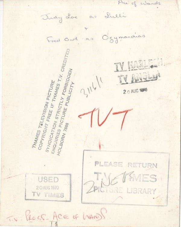 Ace of Wands Judy Loe, Ozymandias Fred Owl Original 7x9 approx Double Weight Silver Gelatin Photo Stamped 1970 VG/Near Mint Condition This item is an ORIGINAL 8x10 photo from the historic archives of Silver Screen Mementos. This original photograph was made in the actual year the film, television show or event was produced. The movie studios produced publicity photographs for distribution to the press, photo agencies and publicity departments to advertise the film/tv show or event. Very often original photos have press release information on the reverse of the photo - movie credits, description of the scene, event and people involved. This is a historic piece of cinema art and is being offered from one collector to another, no rights given or implied. Silver Screen are gradually releasing thousands of Original Photographs, Transparencies, Negatives, Lobby Cards, Posters, Magazines and other memorabilia from our historic archive.