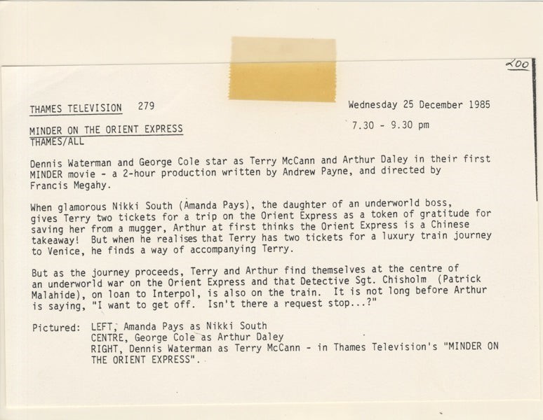 Minder on the Orient Express Dennis Waterman George Cole Amanda Pays 1985 Original 7x9 Photo Stamped by Thames TV with paper caption snipe - Near Mint This item is an ORIGINAL 8x10 photo from the historic archives of Silver Screen Mementos. This original photograph was made in the actual year the film, television show or event was produced. The movie studios produced publicity photographs for distribution to the press, photo agencies and publicity departments to advertise the film/tv show or event. Very often original photos have press release information on the reverse of the photo - movie credits, description of the scene, event and people involved. This is a historic piece of cinema art and is being offered from one collector to another, no rights given or implied. Silver Screen are gradually releasing thousands of Original Photographs, Transparencies, Negatives, Lobby Cards, Posters, Magazines and other memorabilia from our historic archive.