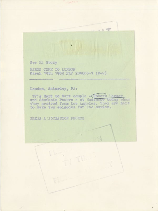 Robert Wagner Hart to Hart Original 7x9 Photo Stefanie Powers Publicity Heathrow London Airport Stamped with Snipe 1983 Near Mint Condition This item is an ORIGINAL 8x10 photo from the historic archives of Silver Screen Mementos. This original photograph was made in the actual year the film, television show or event was produced. The movie studios produced publicity photographs for distribution to the press, photo agencies and publicity departments to advertise the film/tv show or event. Very often original photos have press release information on the reverse of the photo - movie credits, description of the scene, event and people involved. This is a historic piece of cinema art and is being offered from one collector to another, no rights given or implied. Silver Screen are gradually releasing thousands of Original Photographs, Transparencies, Negatives, Lobby Cards, Posters, Magazines and other memorabilia from our historic archive.