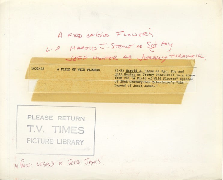 The Legend of Jesse James Original 8x10 Photo Harold J Stone, Jeffrey Hunter A Field of Wild Flowers Episode 1960's TV Western Stamped with Snipe VG/Near Mint Condition This item is an ORIGINAL 8x10 photo from the historic archives of Silver Screen Mementos. This original photograph was made in the actual year the film, television show or event was produced. The movie studios produced publicity photographs for distribution to the press, photo agencies and publicity departments to advertise the film/tv show or event. Very often original photos have press release information on the reverse of the photo - movie credits, description of the scene, event and people involved. This is a historic piece of cinema art and is being offered from one collector to another, no rights given or implied. Silver Screen are gradually releasing thousands of Original Photographs, Transparencies, Negatives, Lobby Cards, Posters, Magazines and other memorabilia from our historic archive.