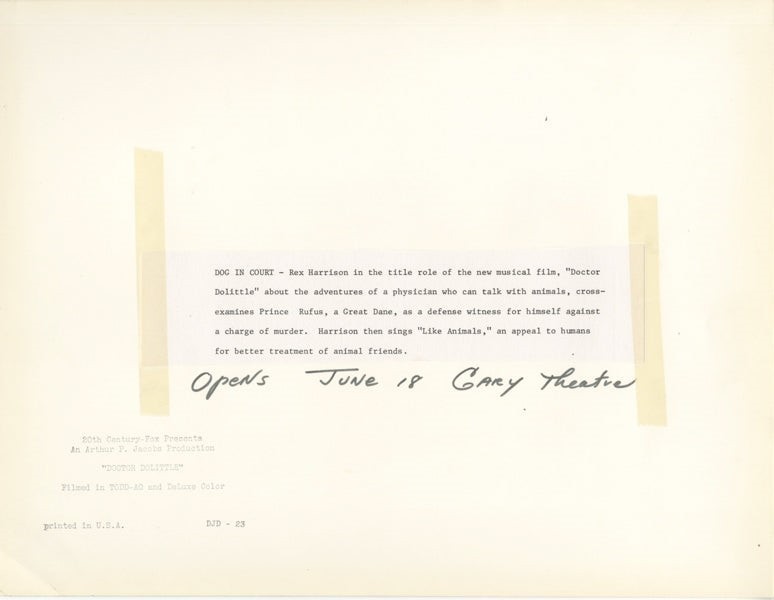 Doctor Dolittle 1967 Rex Harrison Peter Bull Original 10x12 Double Weight Silver Gelatin Photo stamped with paper capton snipe - Near Mint This item is a Vintage Original Oversized Silver Gelatin photograph from the historic archives of Silver Screen Mementos. We have a huge collection of original vintage oversized photographs that were produced by the photographer or photo agency with most having the photographer/agency stamp on the back and many with snipe detailing information about the shoot or subject. These are extremely rare collectors items and will be shipped securely in protective archival top loader holder and strong packaging to ensure safe delivery. This is a historic piece of photographic art and is being offered from one collector to another, no rights given or implied. Silver Screen are gradually releasing thousands of Original Photographs, Transparencies, Negatives, Lobby Cards, Posters, Magazines and other memorabilia from our historic archive