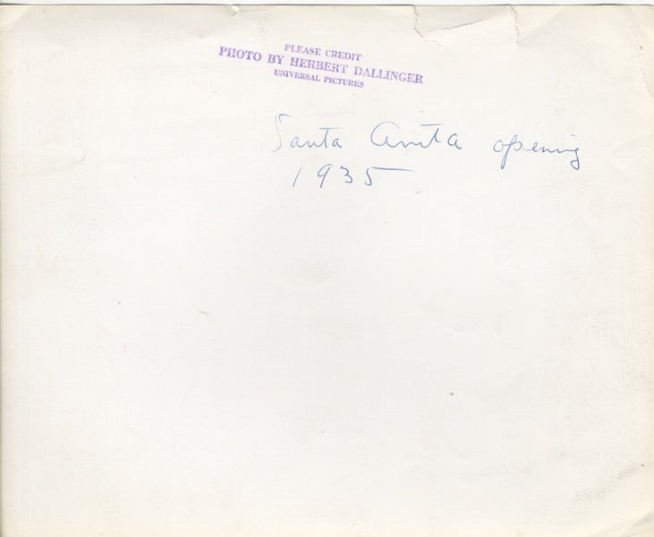 Vintage Santa Anita Racetrack Opening 1934 Stamped Original 8x10 Type 1 Photo - Good Condition (minor tears at edge, border wear) This is an original photograph from our historic archives. We have a huge archive of original photographs, negatives, transparencies, posters, magazines and rare memorabilia that we are gradually releasing.