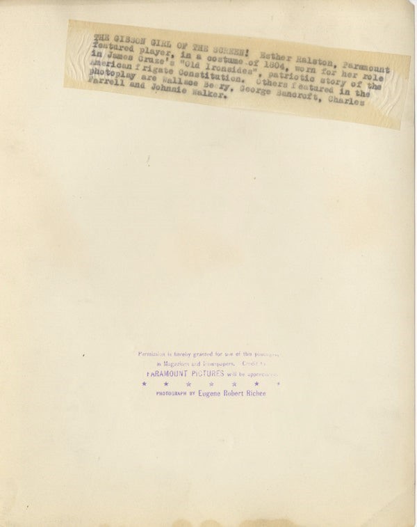 Esther Ralston 1926 Old Ironsides Original 8x10 Photo Stamped Eugene Richee RARE with paper caption snipe - Good Condition (some uneven toning) This item is an ORIGINAL 8x10 photo from the historic archives of Silver Screen Mementos. This original photograph was made in the actual year the film, television show or event was produced. The movie studios produced publicity photographs for distribution to the press, photo agencies and publicity departments to advertise the film/tv show or event. Very often original photos have press release information on the reverse of the photo - movie credits, description of the scene, event and people involved. This is a historic piece of cinema art and is being offered from one collector to another, no rights given or implied. Silver Screen are gradually releasing thousands of Original Photographs, Transparencies, Negatives, Lobby Cards, Posters, Magazines and other memorabilia from our historic archive.