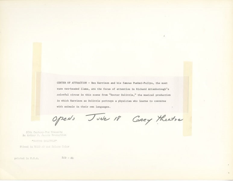 Doctor Dolittle 1967 Rex Harrison LLama Original 10x12 Double Weight Silver gelatin Photo stamped with paper caption snipe - Near Mint This item is a Vintage Original Oversized Silver Gelatin photograph from the historic archives of Silver Screen Mementos. We have a huge collection of original vintage oversized photographs that were produced by the photographer or photo agency with most having the photographer/agency stamp on the back and many with snipe detailing information about the shoot or subject. These are extremely rare collectors items and will be shipped securely in protective archival top loader holder and strong packaging to ensure safe delivery. This is a historic piece of photographic art and is being offered from one collector to another, no rights given or implied. Silver Screen are gradually releasing thousands of Original Photographs, Transparencies, Negatives, Lobby Cards, Posters, Magazines and other memorabilia from our historic archive