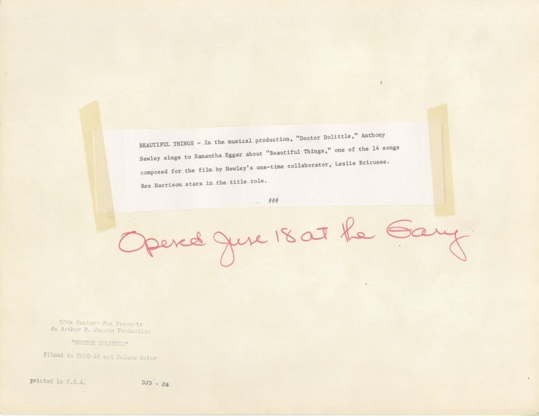 Doctor Dolittle 1967 Samantha Eggar Anthony Newley Original 10x12 Double Weight Silver Gelatin Photo stamped with paper capton snipe - Near Mint This item is a Vintage Original Oversized Silver Gelatin photograph from the historic archives of Silver Screen Mementos. We have a huge collection of original vintage oversized photographs that were produced by the photographer or photo agency with most having the photographer/agency stamp on the back and many with snipe detailing information about the shoot or subject. These are extremely rare collectors items and will be shipped securely in protective archival top loader holder and strong packaging to ensure safe delivery. This is a historic piece of photographic art and is being offered from one collector to another, no rights given or implied. Silver Screen are gradually releasing thousands of Original Photographs, Transparencies, Negatives, Lobby Cards, Posters, Magazines and other memorabilia from our historic archive