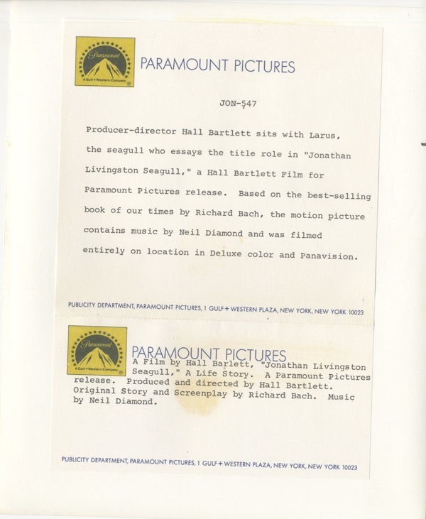 Jonathan Livingston Seagull 1973 Original 8x10 Photo with Snipe Director Hall Bartlett with Larus the Seagull Near Mint Condition This item is an ORIGINAL 8x10 photo from the historic archives of Silver Screen Mementos. This original photograph was made in the actual year the film, television show or event was produced. The movie studios produced publicity photographs for distribution to the press, photo agencies and publicity departments to advertise the film/tv show or event. Very often original photos have press release information on the reverse of the photo - movie credits, description of the scene, event and people involved. This is a historic piece of cinema art and is being offered from one collector to another, no rights given or implied. Silver Screen are gradually releasing thousands of Original Photographs, Transparencies, Negatives, Lobby Cards, Posters, Magazines and other memorabilia from our historic archive.