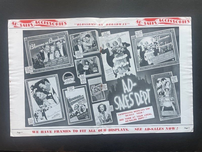 Blossoms on Broadway 1937 Original Movie Pressbook Edward Arnold Shirley Ross - 10 pages of movie poster art, campaign info, photos and articles fom the classic movie in VG Condition A real Collectors’ item being released from our historic archives, this is a complete vintage magazine. Silver Screen Mementos are gradually releasing from their vast archives thousands of original photographs, transparencies, negatives, slides, lobby cards, magazines, brochures, press books and other movie or television memorabilia. This collector's item is being sold from one collector to another, no rights are given or implied. Silver Screen Mementos are gradually releasing from their vast archives thousands of original photographs, transparencies, negatives, slides, lobby cards and other movie or television memorabilia.