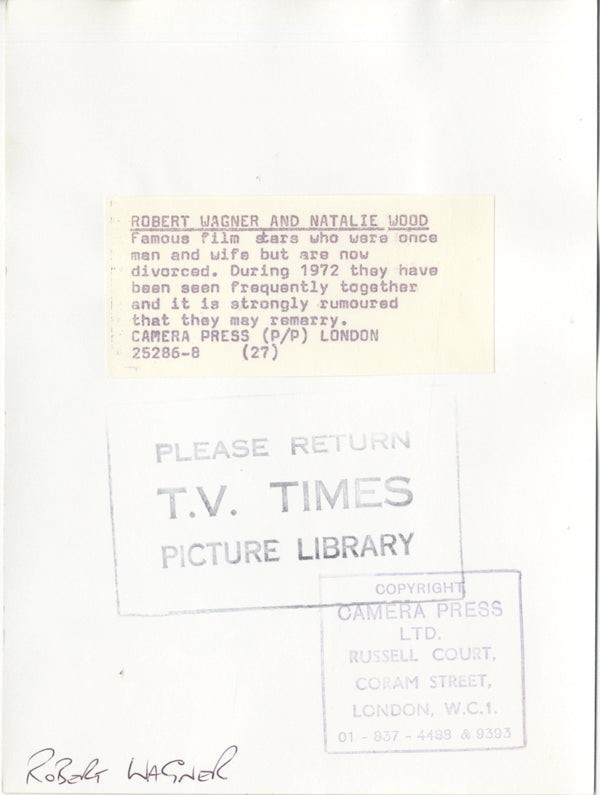 Robert Wagner Gorgeous Natalie Wood 1970's Original 6x8 Silver Gelatin Photo Stamped with Snipe VG/Near Mint Condition This item is an ORIGINAL 8x10 photo from the historic archives of Silver Screen Mementos. This original photograph was made in the actual year the film, television show or event was produced. The movie studios produced publicity photographs for distribution to the press, photo agencies and publicity departments to advertise the film/tv show or event. Very often original photos have press release information on the reverse of the photo - movie credits, description of the scene, event and people involved. This is a historic piece of cinema art and is being offered from one collector to another, no rights given or implied. Silver Screen are gradually releasing thousands of Original Photographs, Transparencies, Negatives, Lobby Cards, Posters, Magazines and other memorabilia from our historic archive.