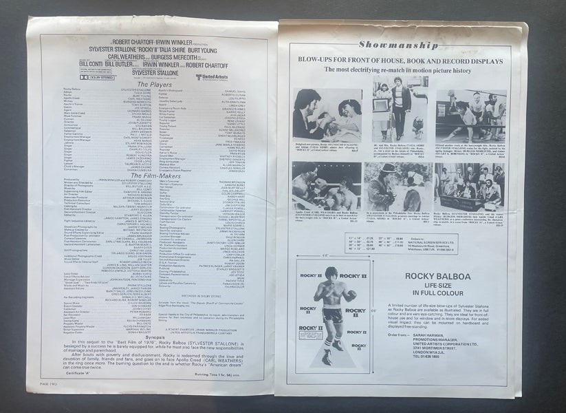 Rocky 2 Original UK Movie Pressbook Sylvester Stallone 8 pages of Poster Art Photos, articles, photos etc in large format 10x14 inch approx VG Condition (some edge wear) A real Collectors’ item being released from our historic archives, this is a complete vintage magazine. Silver Screen Mementos are gradually releasing from their vast archives thousands of original photographs, transparencies, negatives, slides, lobby cards, magazines, brochures, press books and other movie or television memorabilia. This collector's item is being sold from one collector to another, no rights are given or implied. Silver Screen Mementos are gradually releasing from their vast archives thousands of original photographs, transparencies, negatives, slides, lobby cards and other movie or television memorabilia.