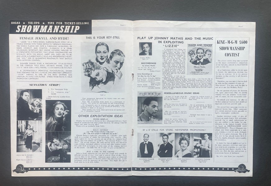 Lizzie 1957 Original Movie Pressbook Eleanor Parker Richard Boone - 8 pages of Movie Poster art , photographs, info etc A real Collectors’ item being released from our historic archives, this is a complete vintage magazine. Silver Screen Mementos are gradually releasing from their vast archives thousands of original photographs, transparencies, negatives, slides, lobby cards, magazines, brochures, press books and other movie or television memorabilia. This collector's item is being sold from one collector to another, no rights are given or implied. Silver Screen Mementos are gradually releasing from their vast archives thousands of original photographs, transparencies, negatives, slides, lobby cards and other movie or television memorabilia.