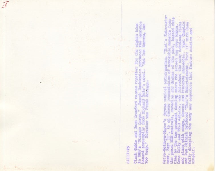 Strange Cargo 1940 Original 8x10 Silver Gelatin Photo Clark Gable, Joan Crawford with Snipe 1967 Re release VG/Near Mint Condition This item is an ORIGINAL 8x10 photo from the historic archives of Silver Screen Mementos. This original photograph was made in the actual year the film, television show or event was produced. The movie studios produced publicity photographs for distribution to the press, photo agencies and publicity departments to advertise the film/tv show or event. Very often original photos have press release information on the reverse of the photo - movie credits, description of the scene, event and people involved. This is a historic piece of cinema art and is being offered from one collector to another, no rights given or implied. Silver Screen are gradually releasing thousands of Original Photographs, Transparencies, Negatives, Lobby Cards, Posters, Magazines and other memorabilia from our historic archive.