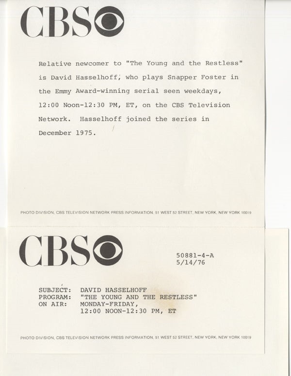 David Hasselhoff The Young and the Restless Original 7x9 Photo Publicity with CBS Snipe 1975 Near Mint Condition This item is an ORIGINAL 8x10 photo from the historic archives of Silver Screen Mementos. This original photograph was made in the actual year the film, television show or event was produced. The movie studios produced publicity photographs for distribution to the press, photo agencies and publicity departments to advertise the film/tv show or event. Very often original photos have press release information on the reverse of the photo - movie credits, description of the scene, event and people involved. This is a historic piece of cinema art and is being offered from one collector to another, no rights given or implied. Silver Screen are gradually releasing thousands of Original Photographs, Transparencies, Negatives, Lobby Cards, Posters, Magazines and other memorabilia from our historic archive.