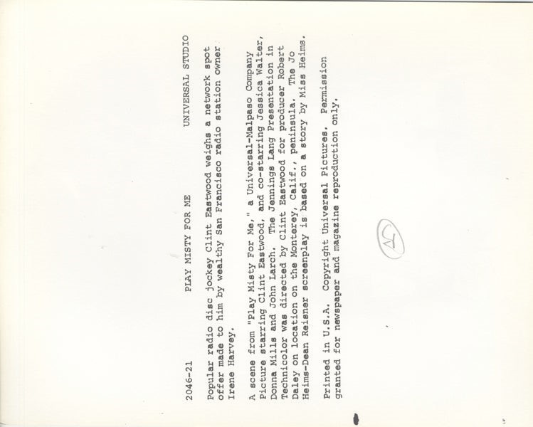 Play Misty For Me 1971 Clint Eastwood Irene Harvey Original 8x10 approx Photo with snipe - Near Mint Condition This item is an ORIGINAL 8x10 photo from the historic archives of Silver Screen Mementos. This original photograph was made in the actual year the film, television show or event was produced. The movie studios produced publicity photographs for distribution to the press, photo agencies and publicity departments to advertise the film/tv show or event. Very often original photos have press release information on the reverse of the photo - movie credits, description of the scene, event and people involved. This is a historic piece of cinema art and is being offered from one collector to another, no rights given or implied. Silver Screen are gradually releasing thousands of Original Photographs, Transparencies, Negatives, Lobby Cards, Posters, Magazines and other memorabilia from our historic archive.