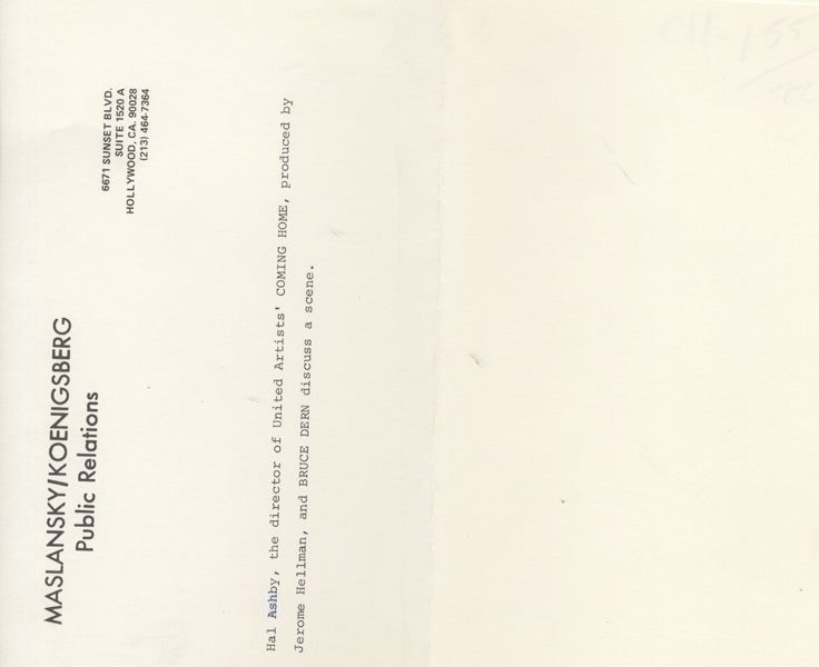 Director Hal Ashby & Bruce Dern Coming Home movie set Original Double Weight silver Gelatin 8x10 Photo with paper caption snipe - Near Mint Condition This item is an ORIGINAL 8x10 photo from the historic archives of Silver Screen Mementos. This original photograph was made in the actual year the film, television show or event was produced. The movie studios produced publicity photographs for distribution to the press, photo agencies and publicity departments to advertise the film/tv show or event. Very often original photos have press release information on the reverse of the photo - movie credits, description of the scene, event and people involved. This is a historic piece of cinema art and is being offered from one collector to another, no rights given or implied. Silver Screen are gradually releasing thousands of Original Photographs, Transparencies, Negatives, Lobby Cards, Posters, Magazines and other memorabilia from our historic archive.