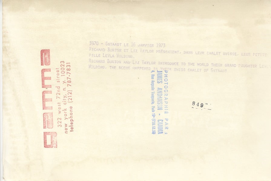 Elizabeth Taylor, Richard Burton Original 8x12 Photo 1973 in Gstaad at their Swiss Chalet with Leyla Wilding Stamped with Snipe VG/Near Mint Condition This item is an ORIGINAL 8x10 photo from the historic archives of Silver Screen Mementos. This original photograph was made in the actual year the film, television show or event was produced. The movie studios produced publicity photographs for distribution to the press, photo agencies and publicity departments to advertise the film/tv show or event. Very often original photos have press release information on the reverse of the photo - movie credits, description of the scene, event and people involved. This is a historic piece of cinema art and is being offered from one collector to another, no rights given or implied. Silver Screen are gradually releasing thousands of Original Photographs, Transparencies, Negatives, Lobby Cards, Posters, Magazines and other memorabilia from our historic archive.