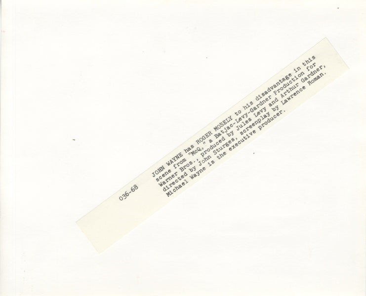 John Wayne McQ 1974 Original 8x10 Silver Gelatin Photo Robert Mosely with Snipe Near Mint Condition This item is an ORIGINAL 8x10 photo from the historic archives of Silver Screen Mementos. This original photograph was made in the actual year the film, television show or event was produced. The movie studios produced publicity photographs for distribution to the press, photo agencies and publicity departments to advertise the film/tv show or event. Very often original photos have press release information on the reverse of the photo - movie credits, description of the scene, event and people involved. This is a historic piece of cinema art and is being offered from one collector to another, no rights given or implied. Silver Screen are gradually releasing thousands of Original Photographs, Transparencies, Negatives, Lobby Cards, Posters, Magazines and other memorabilia from our historic archive.