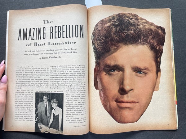 Motion Picture Magazine Jeanne Crain Leggy Cover Photo Betty Grable August 1950 - complete issue featuring Shirley Temple, Burt LancasterJoan Evans, Kirk Douglas, William Holden etc. VG Condition A real Collectors’ item being released from our historic archives, this is a complete vintage magazine. Silver Screen Mementos are gradually releasing from their vast archives thousands of original photographs, transparencies, negatives, slides, lobby cards, magazines, brochures, press books and other movie or television memorabilia. This collector's item is being sold from one collector to another, no rights are given or implied. Silver Screen Mementos are gradually releasing from their vast archives thousands of original photographs, transparencies, negatives, slides, lobby cards and other movie or television memorabilia.