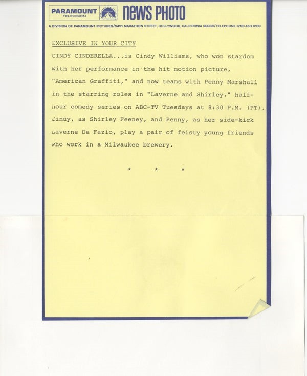 Laverne and Shirley Original 8x10 Photo Cindy Williams 1975 Publicity Portrait with Snipe Near Mint Condition This item is an ORIGINAL 8x10 photo from the historic archives of Silver Screen Mementos. This original photograph was made in the actual year the film, television show or event was produced. The movie studios produced publicity photographs for distribution to the press, photo agencies and publicity departments to advertise the film/tv show or event. Very often original photos have press release information on the reverse of the photo - movie credits, description of the scene, event and people involved. This is a historic piece of cinema art and is being offered from one collector to another, no rights given or implied. Silver Screen are gradually releasing thousands of Original Photographs, Transparencies, Negatives, Lobby Cards, Posters, Magazines and other memorabilia from our historic archive.
