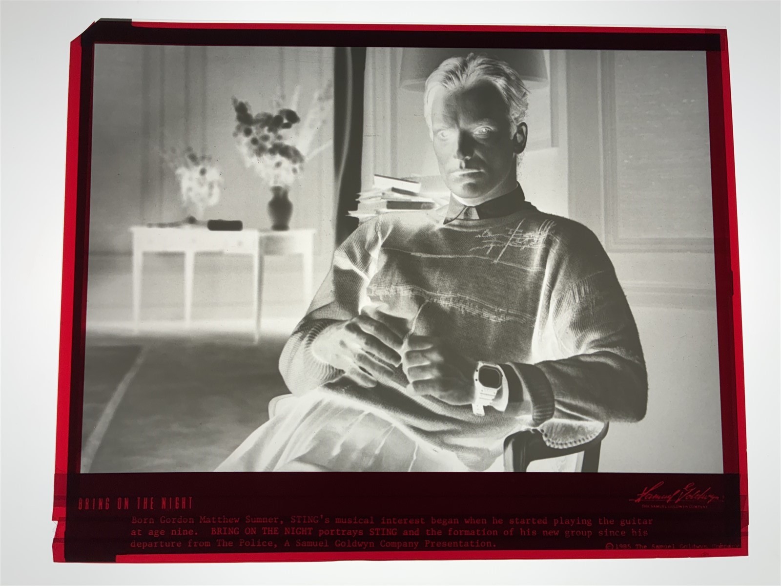 Sting The Police 1985 Bring on the Night Photo Shoot Vintage 8x10 Studio Negative This is a vintage studio or photographer's 8x10 inch black and white photographic negative from that was from the famed Marvin Paige Motion Picture and Television Research Archive. Marvin Paige was a renowned Hollywood casting agent who had worked on such productions as 'Breakfast at Tiffany's and 'Planet of the Apes' and a film historian who had amassed a huge archive of movie and television images and memorabilia . This vintage negative was created from the original camera negative by the studio or photographer in order to make prints and use for publications. This is a real collector's item and would make superb quality photographs or prints. This would also be a great addition to any collection or image archive. This black and white photographic negative is in Excellent condition. This collector's item is being sold from one collector to another, no rights are given or implied. Silver Screen Mementos are gradually releasing from their vast archives thousands of original photographs, transparencies, negatives, slides, lobby cards and other movie or television memorabilia.