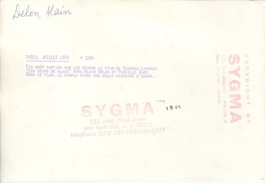 Alain Delon, Mirelle Darc Someone is Bleeding 1974 aka Les seins de glace Original 8x12 Photo Stamped with Snipe VG/Near Mint Condition This item is an ORIGINAL 8x10 photo from the historic archives of Silver Screen Mementos. This original photograph was made in the actual year the film, television show or event was produced. The movie studios produced publicity photographs for distribution to the press, photo agencies and publicity departments to advertise the film/tv show or event. Very often original photos have press release information on the reverse of the photo - movie credits, description of the scene, event and people involved. This is a historic piece of cinema art and is being offered from one collector to another, no rights given or implied. Silver Screen are gradually releasing thousands of Original Photographs, Transparencies, Negatives, Lobby Cards, Posters, Magazines and other memorabilia from our historic archive.
