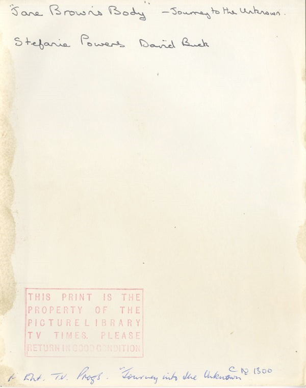 Journey to the Unknown Stefanie Powers David Buck 1968 Original 8x10 Photo VG Condition This item is an ORIGINAL 8x10 photo from the historic archives of Silver Screen Mementos. This original photograph was made in the actual year the film, television show or event was produced. The movie studios produced publicity photographs for distribution to the press, photo agencies and publicity departments to advertise the film/tv show or event. Very often original photos have press release information on the reverse of the photo - movie credits, description of the scene, event and people involved. This is a historic piece of cinema art and is being offered from one collector to another, no rights given or implied. Silver Screen are gradually releasing thousands of Original Photographs, Transparencies, Negatives, Lobby Cards, Posters, Magazines and other memorabilia from our historic archive.