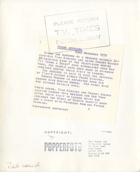 Robert Wagner, Tina Sinatra Candid 1970 London Original 8x10 Photo Stamped with Snipe VG/Near Mint Condition This item is an ORIGINAL 8x10 photo from the historic archives of Silver Screen Mementos. This original photograph was made in the actual year the film, television show or event was produced. The movie studios produced publicity photographs for distribution to the press, photo agencies and publicity departments to advertise the film/tv show or event. Very often original photos have press release information on the reverse of the photo - movie credits, description of the scene, event and people involved. This is a historic piece of cinema art and is being offered from one collector to another, no rights given or implied. Silver Screen are gradually releasing thousands of Original Photographs, Transparencies, Negatives, Lobby Cards, Posters, Magazines and other memorabilia from our historic archive.