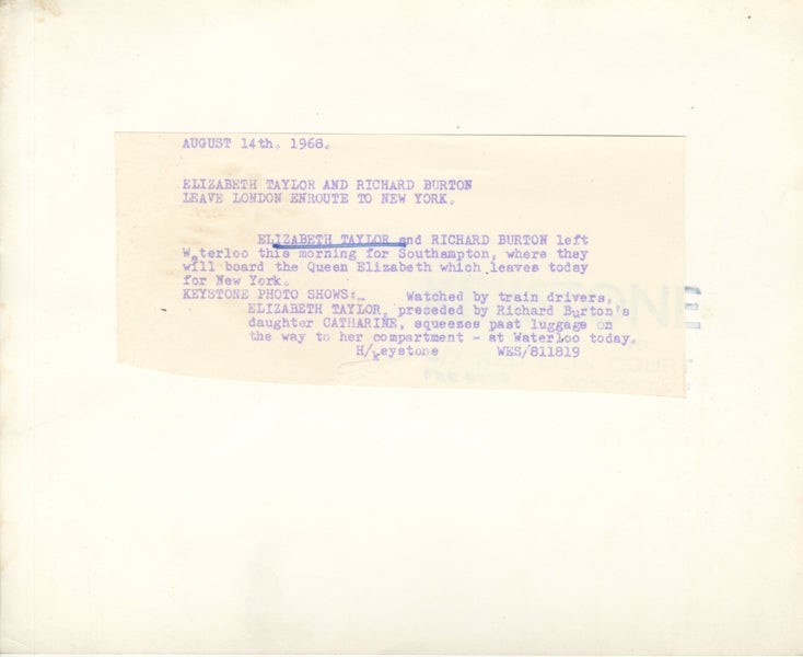 Elizabeth Taylor Waterloo Train Station London Double Weight Original 8x10 Photo with paper caption snipe in VG/Near Mint Condition This item is an ORIGINAL 8x10 photo from the historic archives of Silver Screen Mementos. This original photograph was made in the actual year the film, television show or event was produced. The movie studios produced publicity photographs for distribution to the press, photo agencies and publicity departments to advertise the film/tv show or event. Very often original photos have press release information on the reverse of the photo - movie credits, description of the scene, event and people involved. This is a historic piece of cinema art and is being offered from one collector to another, no rights given or implied. Silver Screen are gradually releasing thousands of Original Photographs, Transparencies, Negatives, Lobby Cards, Posters, Magazines and other memorabilia from our historic archive.
