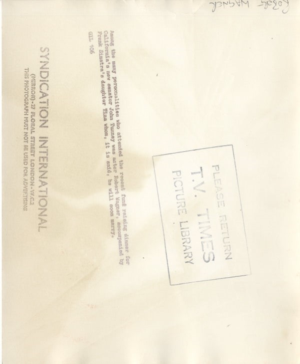 Robert Wagner & Tina Sinatra Original Double Weight Silver Gelatin Stamped 8x10 Photo VG/Near Mint This item is an ORIGINAL 8x10 photo from the historic archives of Silver Screen Mementos. This original photograph was made in the actual year the film, television show or event was produced. The movie studios produced publicity photographs for distribution to the press, photo agencies and publicity departments to advertise the film/tv show or event. Very often original photos have press release information on the reverse of the photo - movie credits, description of the scene, event and people involved. This is a historic piece of cinema art and is being offered from one collector to another, no rights given or implied. Silver Screen are gradually releasing thousands of Original Photographs, Transparencies, Negatives, Lobby Cards, Posters, Magazines and other memorabilia from our historic archive.